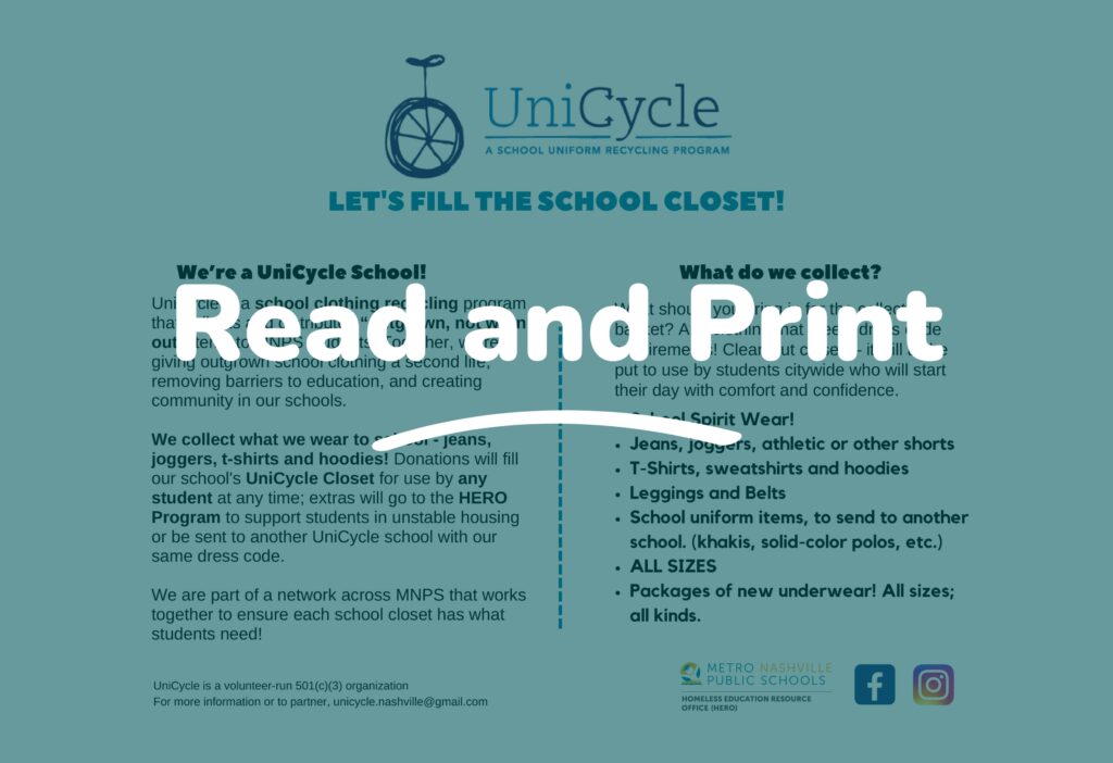 The UniCycle program provides school clothing to students in need within the Metro Nashville Public School (MNPS) system by collecting new and gently-used items in schools and distributing them at the school level and through a partnership with the Homeless Education Resource Office (HERO).