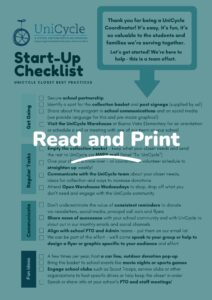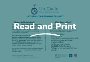 Here are some resources for a closer look into how we work and what it means to be a UniCycle Coordinator at your school. It’s a fun and easy role, doesn’t take much time, and you’ll be helping students both in your school and throughout the district in a simple, direct way every day! We’re ready to help get you started.